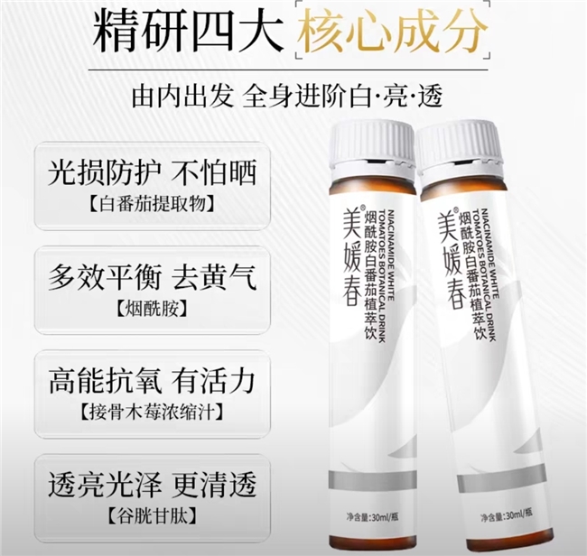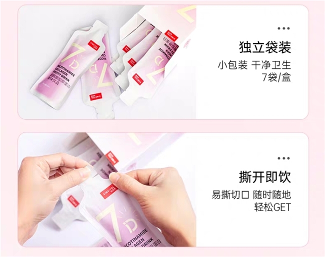 走平价高效路线,专为产后、学生党设计,烟酰胺搭配天然植萃成分,降低刺激性,精准改善产后黄气、肤色不均,同时补充肌肤水分,缓解产后肌肤干燥问题。配方精简无冗余,零防腐剂、零香精,经过敏感肌测试,温和适配产后脆弱肌肤,口感清爽酸甜,独立小瓶包装,便携易饮,每天1支无负担,坚持饮用可让肤色变得匀净透亮。